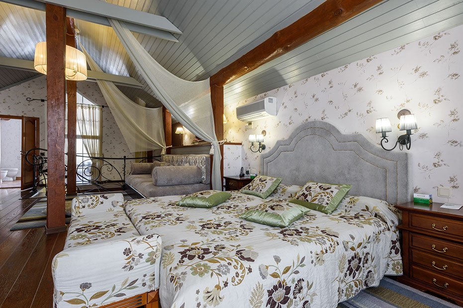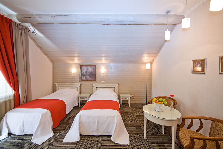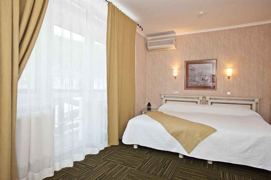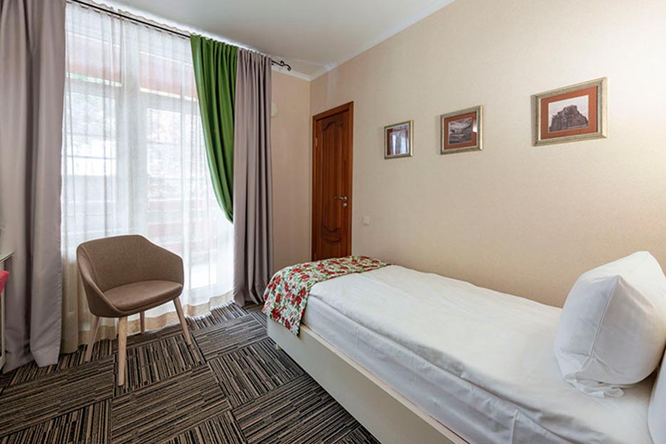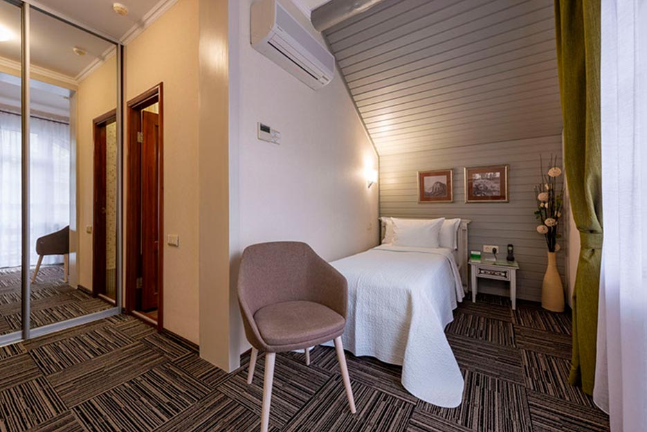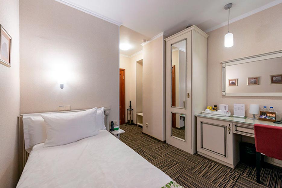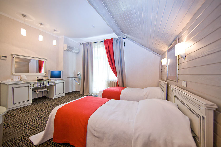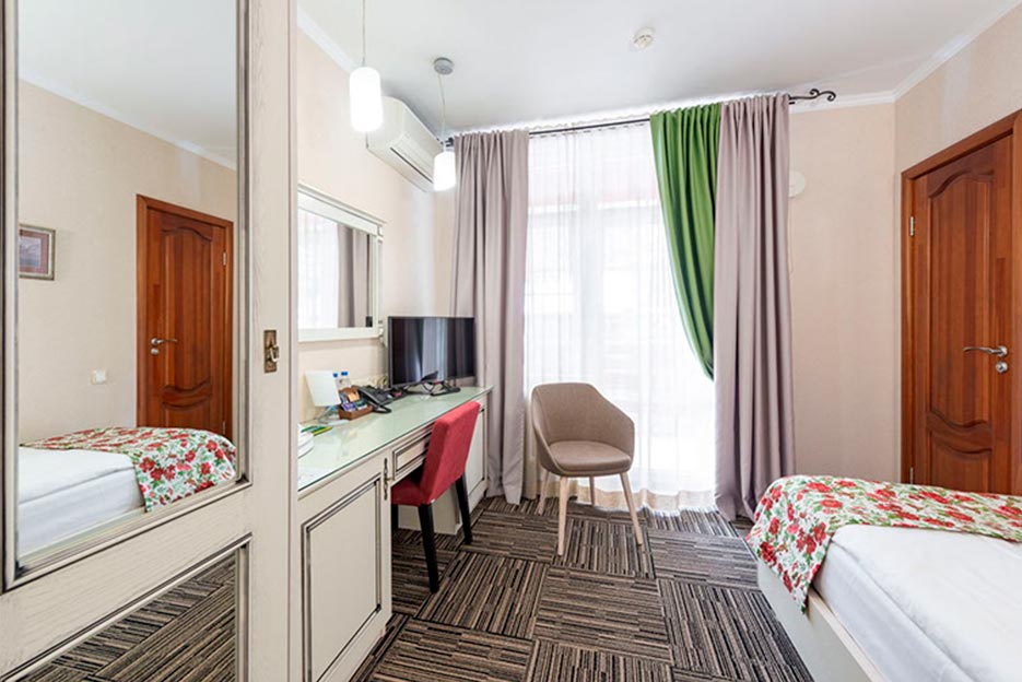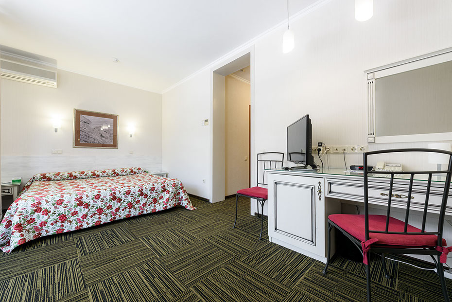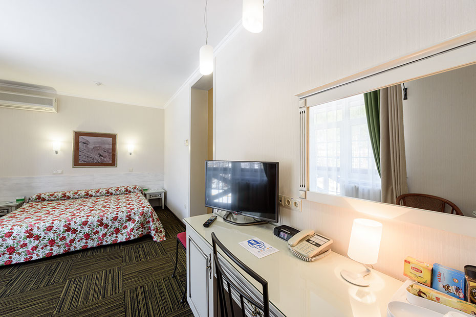 В номере: 2 односпальные/двуспальная/односпальная кровати, ортопедические подушки с «эффектом памяти», кондиционер, телевизор, фен, телефон, гладильный центр, мини-бар, чайник, набор посуды, сейф индивидуальный, косметический набор, халат, тапочки, зонт, питьевая вода в бутылках (ежедневное пополнение).